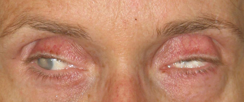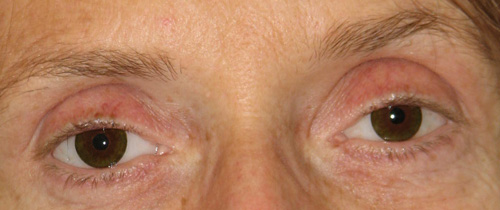 Slight enophthalmos, eyelid laxity and reduced conjunctival sac.