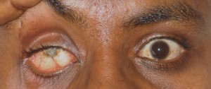 Subatrophic eye with leucomatous and displaced cornea.