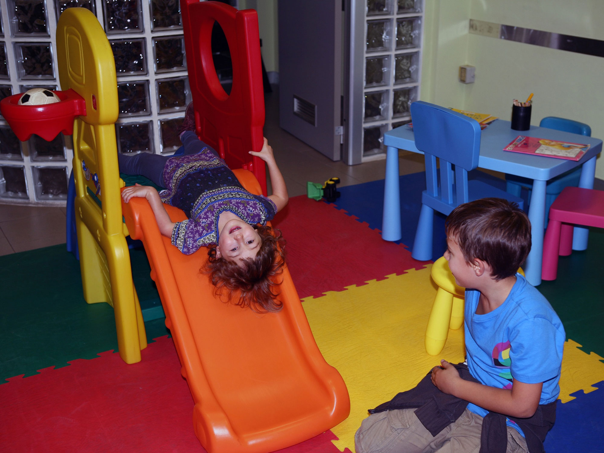 Giochi adatti a tutte le età, una TV dedicata, libri illustrati, giornali da colorare, un ampio e morbido tappeto multicolore che rendono lo spazio accogliente e divertente.